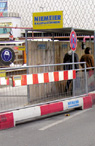Zur Fahrbahnseite hin erfolgt eine Abtrennung durch eine 1,0m hohe Spritzschutzmauer und zur Baustelle schützt ein 2,0m hoher Holzbauzaun. |
